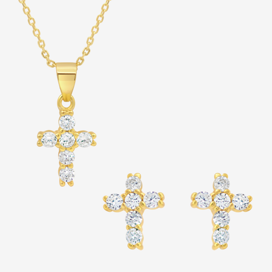 Shop the gold cross crystal jewellery set with K&Co. Silver round stones and matching earrings. A meaningful gold-tone faith jewellery gift.